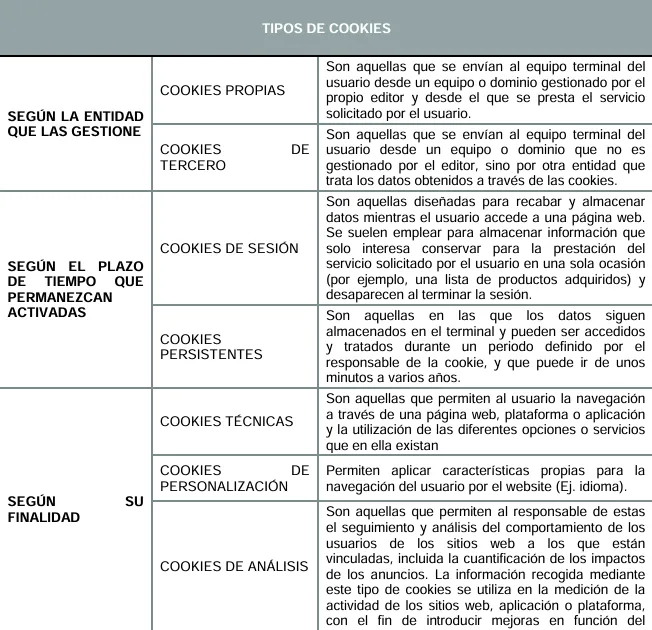 La información que le proporcionamos a continuación le ayudará a comprender los diferentes tipos de cookies: